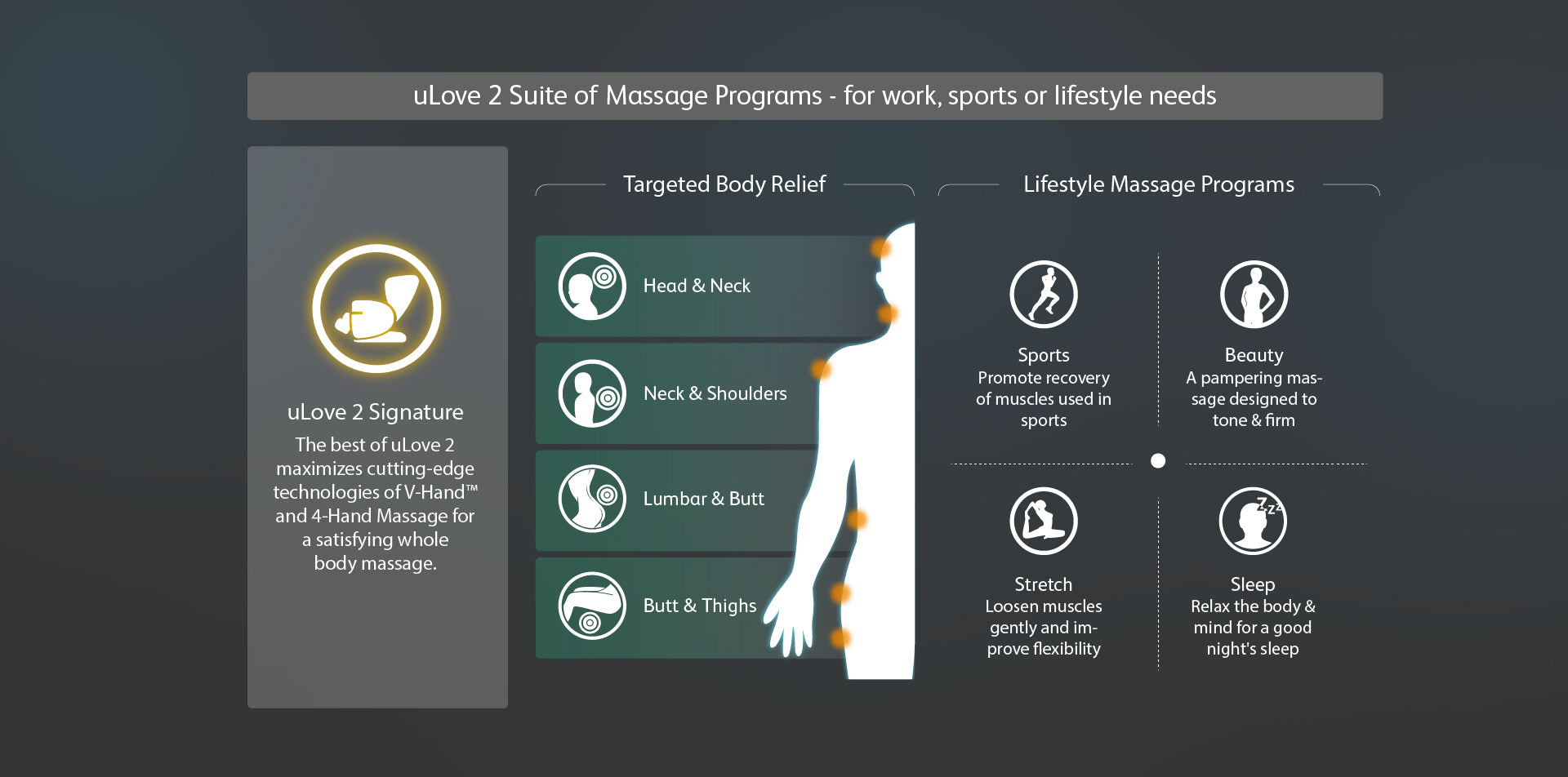 OSIM uLove 2 Full-Body Massage Chair offers a signature suite of auto massage programs, designed by Japanese Massage Expert - Sato Tsuyoshi, that are customized to your needs with personalized features to tailor the massage position just for you: